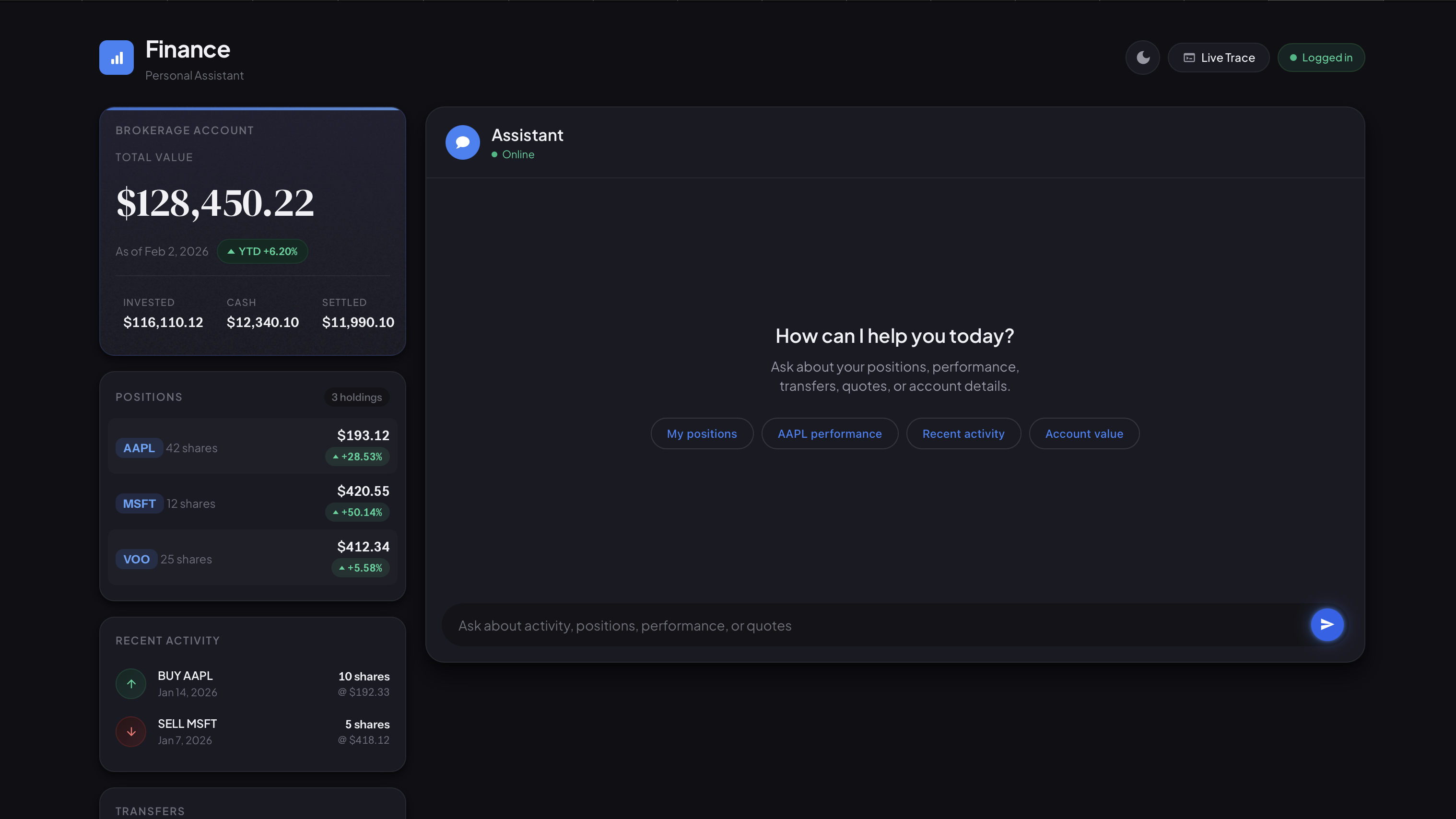 A proof-of-concept showing how to build trustworthy conversational AI for finance. Ask natural questions like "How did my portfolio do YTD?" or "What's my AAPL position worth?" and get grounded answers with full observability into every routing decision and tool call.